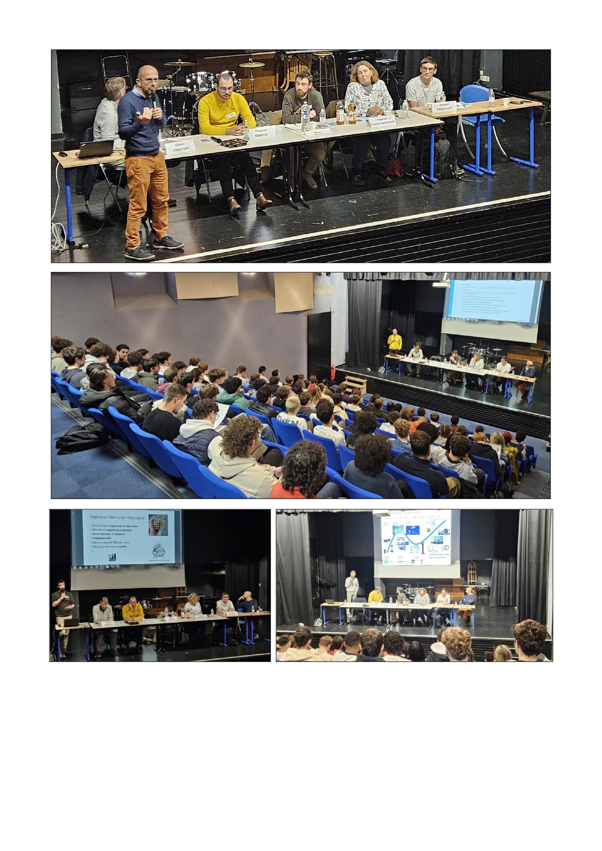 Le public, principalement constitué d'étudiants de CPGE et d'élèves de terminale du lycée, a été attentif aux contenus des différents témoignages : cursus de formations, parcours professionnels, emplois du temps, responsabilités, évolutions de carrière, salaires, projets…